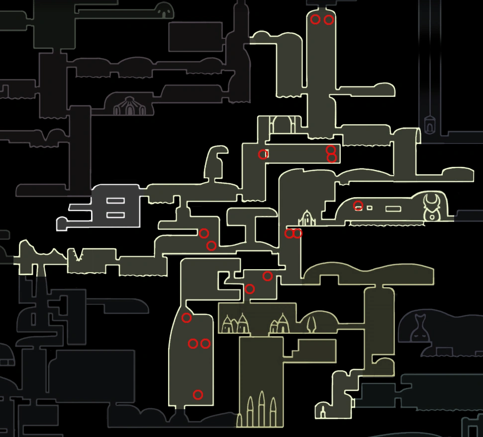 | Vergessene Wegkrezung | Krabbler • Rachfliege • König der Rachfliegen • Grummer • Grummermutter • Tiktik • Aspidjäger • Aspidmutter • Aspidjunges • Goam • Wandernde Hülle • Hornkäferhülle • Springende Hülle • Grobianhülle • Kriegerhülle • Wachkäferhülle • Begrabene Hülle • Falscher Ritter • Gescheiterter Beschützer • Made • Flickerkäfer • Lebenskeim • Baldur • Älterer Baldur • Der Hollow Knight • Das Vergessene Licht |