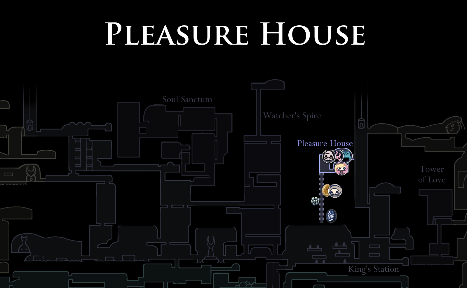 The abode of the Collector, a being of Void who loves capturing creatures in glass jars. Accessible from Kingdom's Edge using the Love Key (acquired from a corpse in the Queen's Gardens). After flipping a switch, it can be exited into King's Station. Defeating the Collector enables 3 Grubs to be rescued and the Collector's Map to be acquired, which marks the location of un-rescued Grubs on the map.