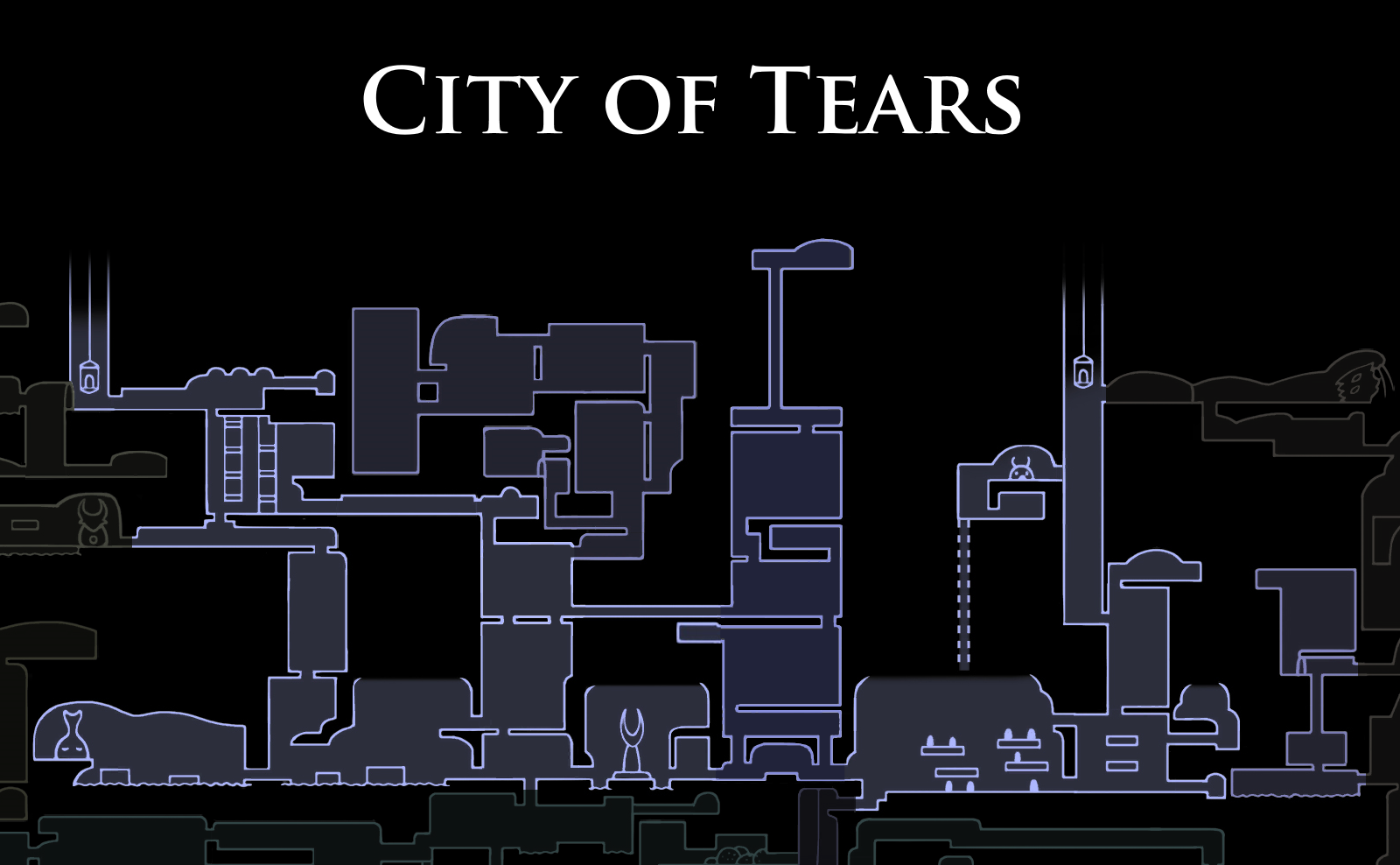 The City of Tears is the capital city of Hallownest which is located in the centre of the kingdom. It is covered in perpetual rainfall that originates from the ceiling above. Its original name was lost to history.